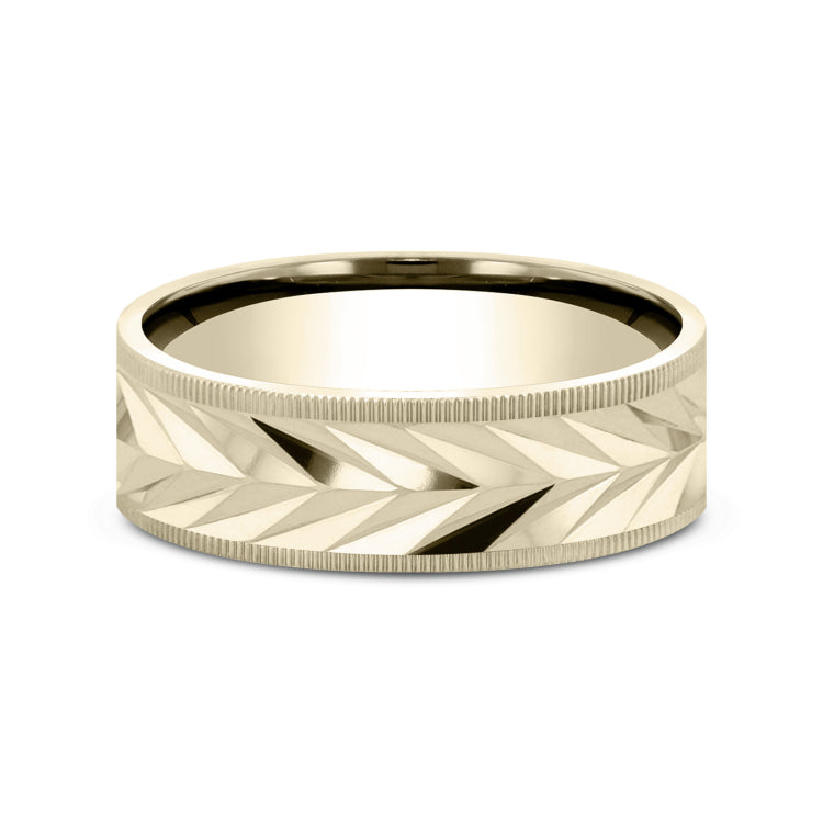 7mm, Comfort fit14K Yellow GoldEmmer wheat pattern, milgrain edges