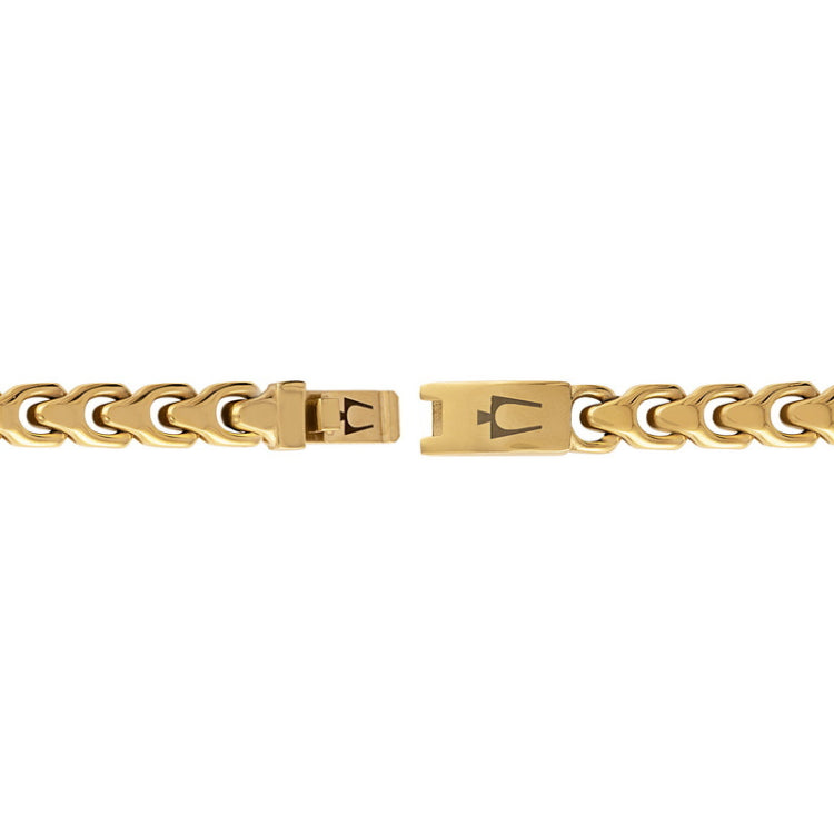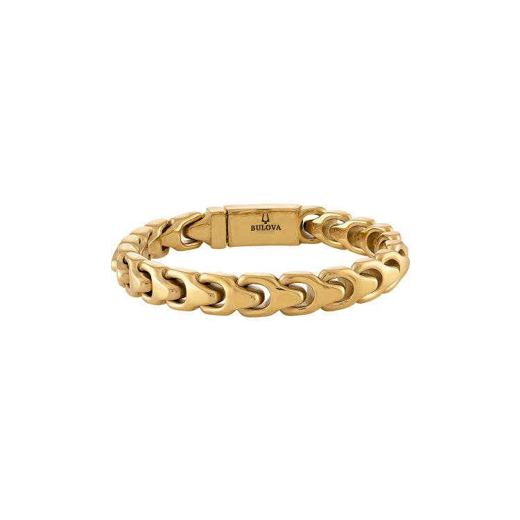 The fresh new Bulova Link™ Collection abounds in both personality and presence as our iconic tuning fork makes its debut as a signature design element. Destined to become a classic, this sleek and stylish 10MM gold-tone stainless steel bracelet makes a bold statement. Measures 8.5" in length and features a box lock clasp etched with Bulova's iconic logo.