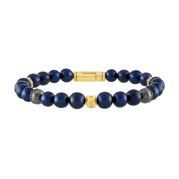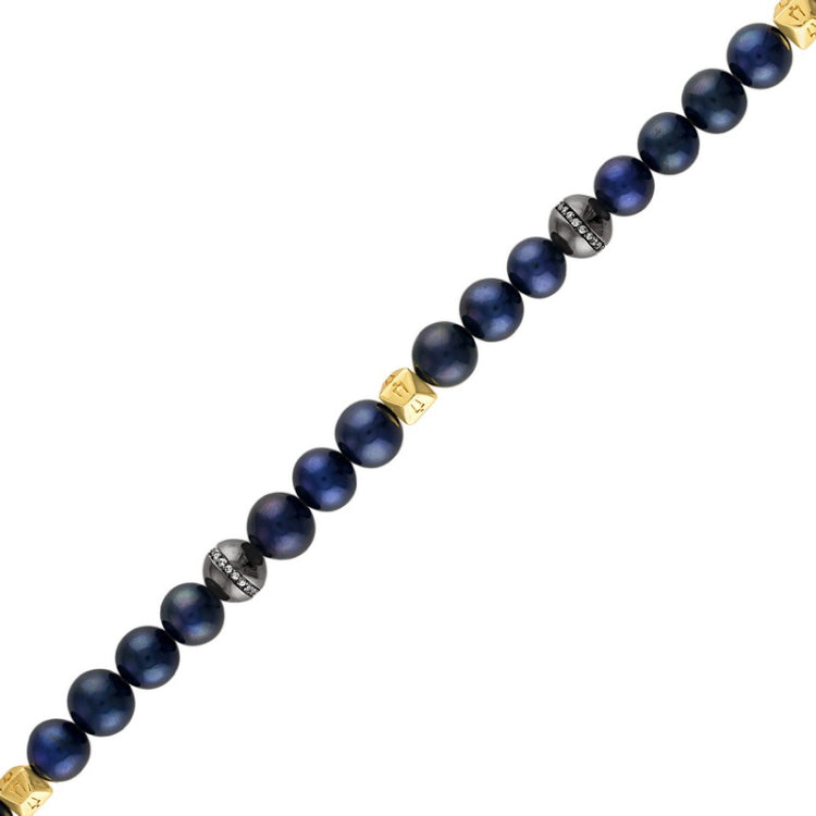 Matte black freshwater pearls in a beaded 8.5" bracelet accented with 2 black ruthenium-plated sterling silver beads set with white diamonds totaling 0.20 CTTW, and contrasted by 3 gold-tone hexagonal spheres etched with Bulova tuning fork icon on all sides. Magnetic cylinder clasp in 14K gold-plated sterling silver etched with iconic tuning fork logo.