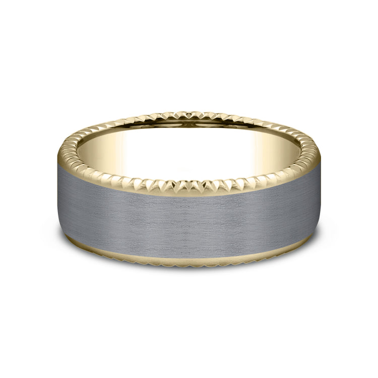 7.5mm, Comfort fit14K Yellow Gold and Grey TantalumSatin center, fluted face