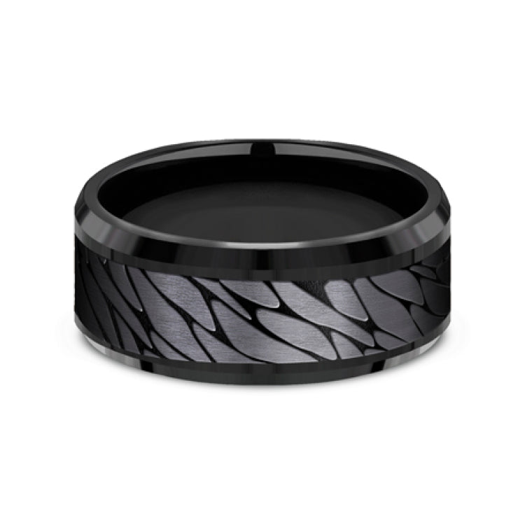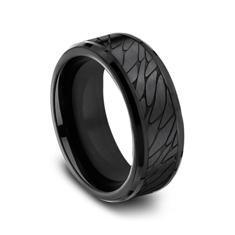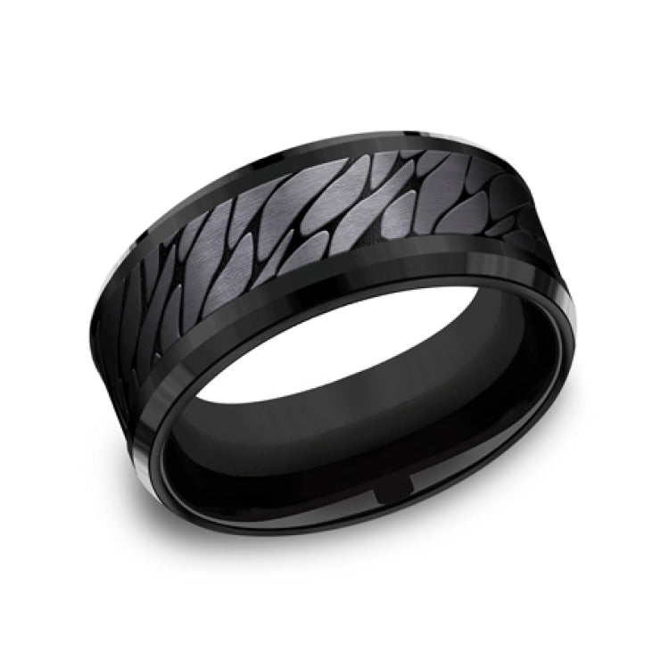 9mm, Comfort fitBlack TitaniumPebble patterned center, bevel edges
