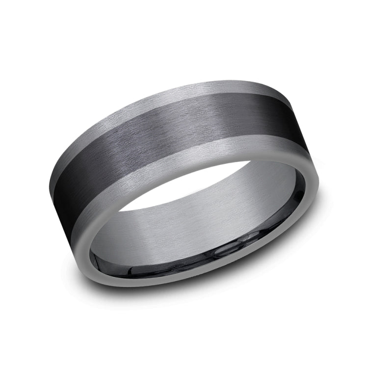 8mm, Comfort fitGrey Tantalum and Black TitaniumSatin center, straight edges