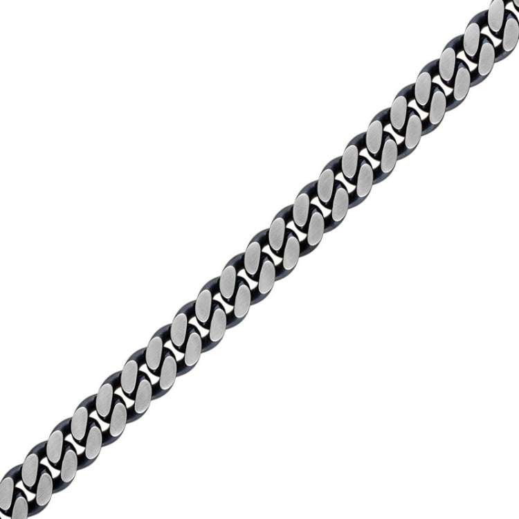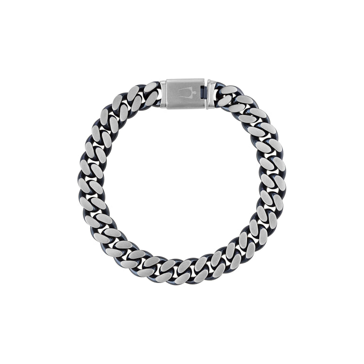 A classic Bulova curb chain of dual-surfaced links updated with an exciting colorful twist. Distinctly bold 8.5" bracelet made of 10MM brushed stainless steel in a striking blue and steel color combination. Custom-designed clasp with tongue in the shape of the Bulova signature tuning fork is subtly branded with our iconic logo.