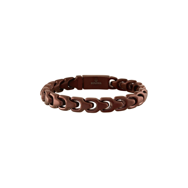 The fresh new Bulova Link™ Collection abounds in both personality and presence as our iconic tuning fork makes its debut as a signature design element. In an eye-catchingly unique chocolate brown satin finish, this avant-garde 8MM stainless steel bracelet is a bold standout piece. Measures 8" in length and features a box lock clasp etched with the Bulova brand name and logo.