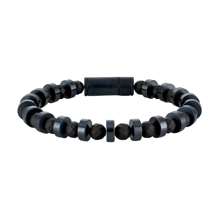 Beaded bracelet with alternating navy steel discs and faceted beads of matte black onyx, a semi-precious stone of protection, believed to promote physical strength and stamina. Features a magnetic closure in navy blue-tone stainless steel branded with our iconic logo. Use as a stand-alone piece or as the perfect addition to achieve a layered look. Measures 8" in length.