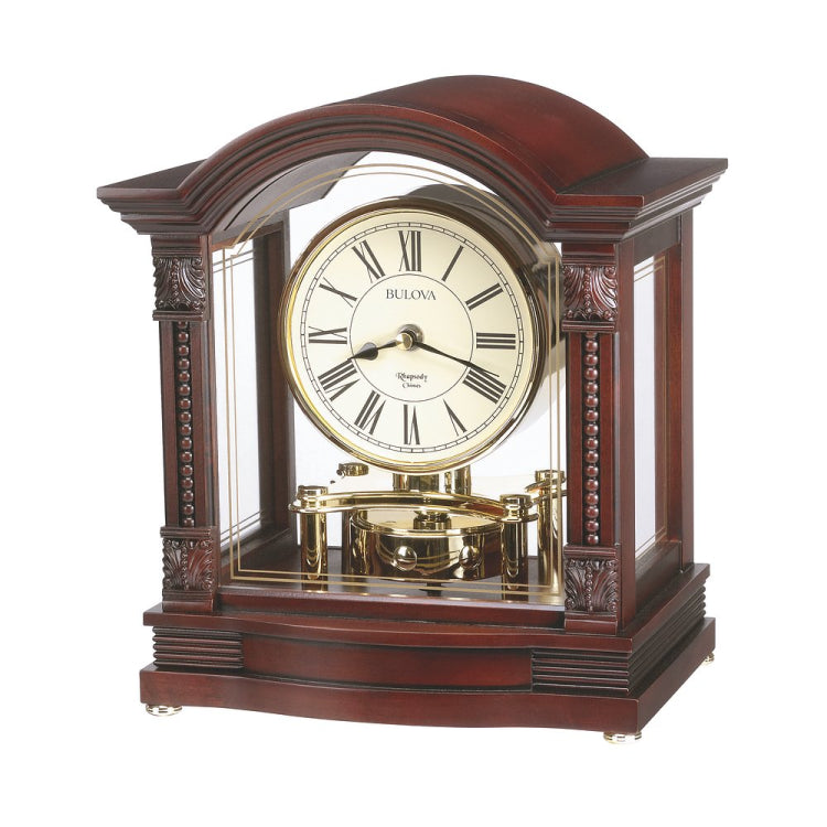 Wood case, antique walnut finish. Decorative carved accents. Polished brass finish accents and revolving pendulum. Decorative screened glass front and side panels. Removable clear acrylic back panel. Choice of Westminster, 4/4 Westminster or Bim-Bam melody. Counts the hour. Adjustable volume control. Three-position chime switch offers choice of silent, nigh shut-off or lowered volume at night.