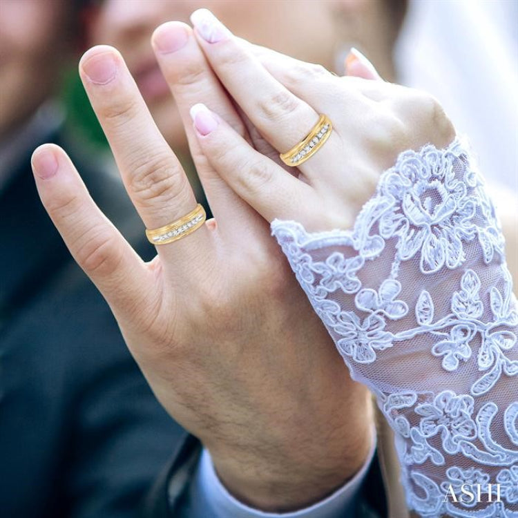 Timeless in nature, this alluring diamond duos ring Set shines with glamour and expresses the symmetry of your love. Each ring in the set is embellished with 9 splendid round cut diamonds with nick set and glistens luminously in 10 karat yellow gold with milgrain. The total diamond weight for the set is 1/4 Ctw.