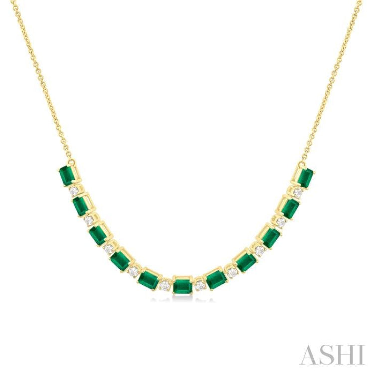 An exquisite expression of refined elegance, this precious tennis necklace is a testament to exquisite craftsmanship and thoughtful design, a piece destined to become a cherished highlight in your jewelry collection. It features an alternating row of vibrant emeralds and dazzling diamonds that gracefully trace the neckline. 11 fancy set 4X3MM octagon cut emeralds lend a lush, verdant allure, while 10 prong hand set round cut diamonds provide a brilliant contrast. The precious tennis necklace is beautifully anchored by a Cable Chain 1.20 MM in 18 Inches with Lobster Lock & Extenders at 16 & 17, ensuring a sleek, versatile drape that elevates any ensemble. It is styled in a 14 karat yellow gold. Total diamond weight is 1/2 ctw.