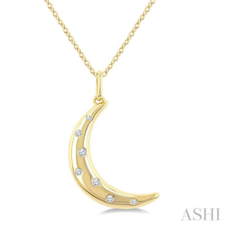 A timeless emblem of change, intuition, and new beginnings, the crescent moon reflects the ever-evolving journey of life and the quiet strength found in transitions. This crescent diamond fashion pendant, from the popular Petite Collection, beautifully embodies this symbolism. It features a smooth gold crescent moon shape, adorned with 7 flush set round cut diamonds in three varying sizes, artistically arranged in a mosaic finish to mimic scattered starlight across its surface. An Cable Chain 0.85 MM in 18 Inches with Spring Lock & Extenders at 16" & 17" carries, via a plain gold bail, the celestial fashion pendant, all molded in 10 karat yellow gold. Total diamond weight is 1/20 ctw.