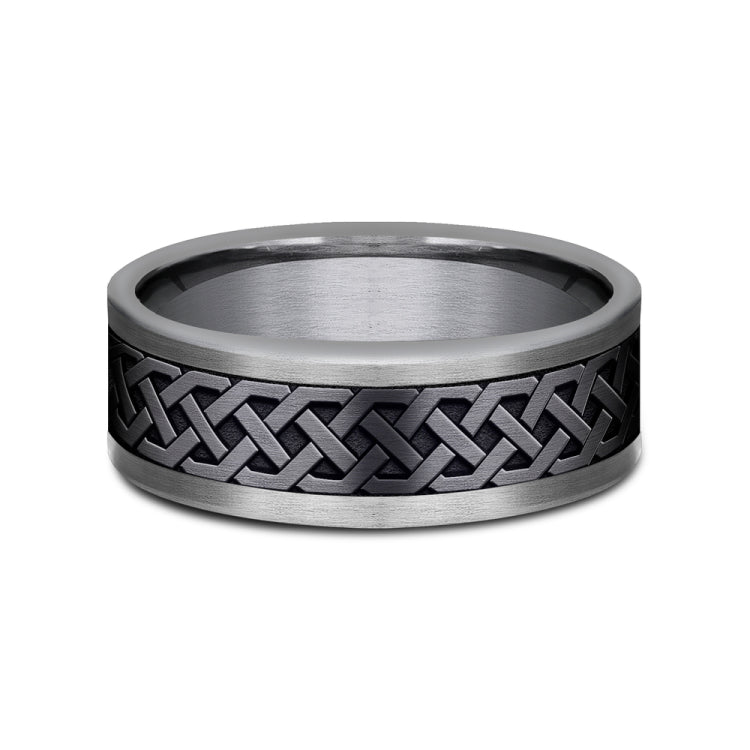 8mm, Comfort fitGrey Tantalum and Black TitaniumCeltic knot patterned center, straight edges