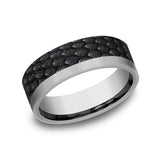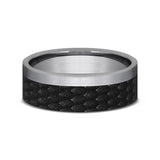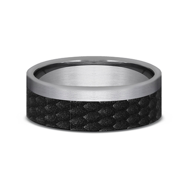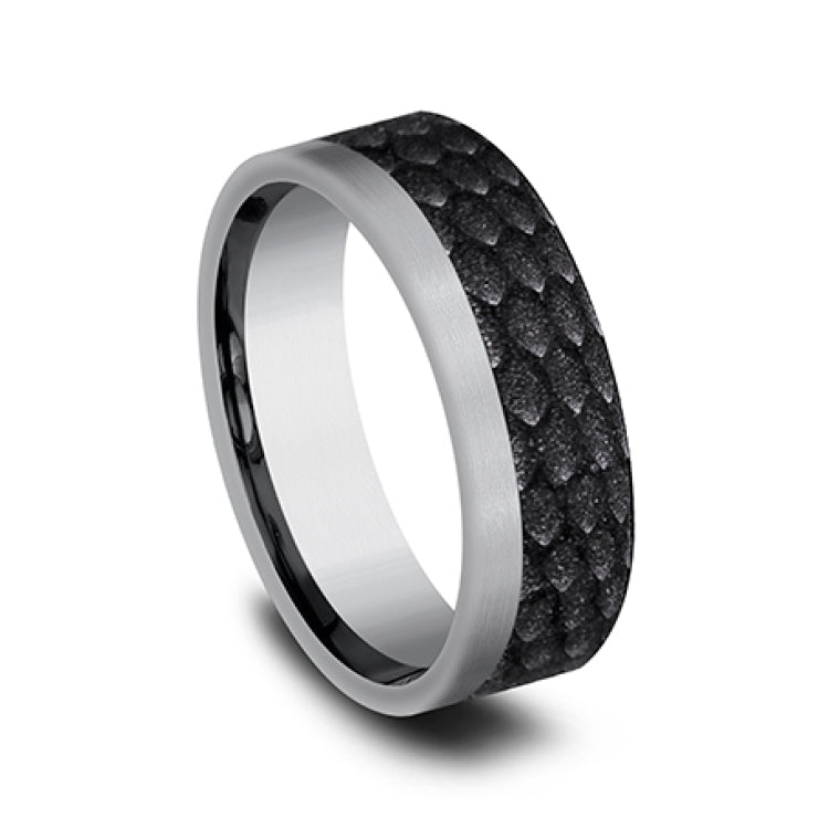 7mm, Comfort fitGrey Tantalum and Black TitaniumDragon scale pattern, one satin edge