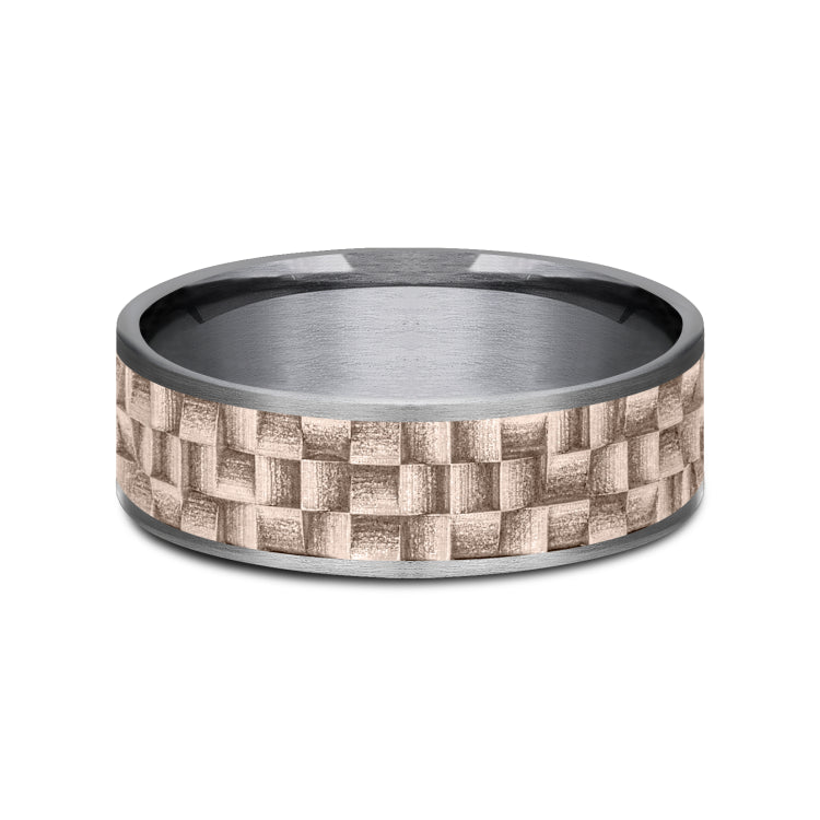 7.5mm, Comfort fitGrey Tantalum and 14K Rose GoldWicker weave patterned center, thin edges